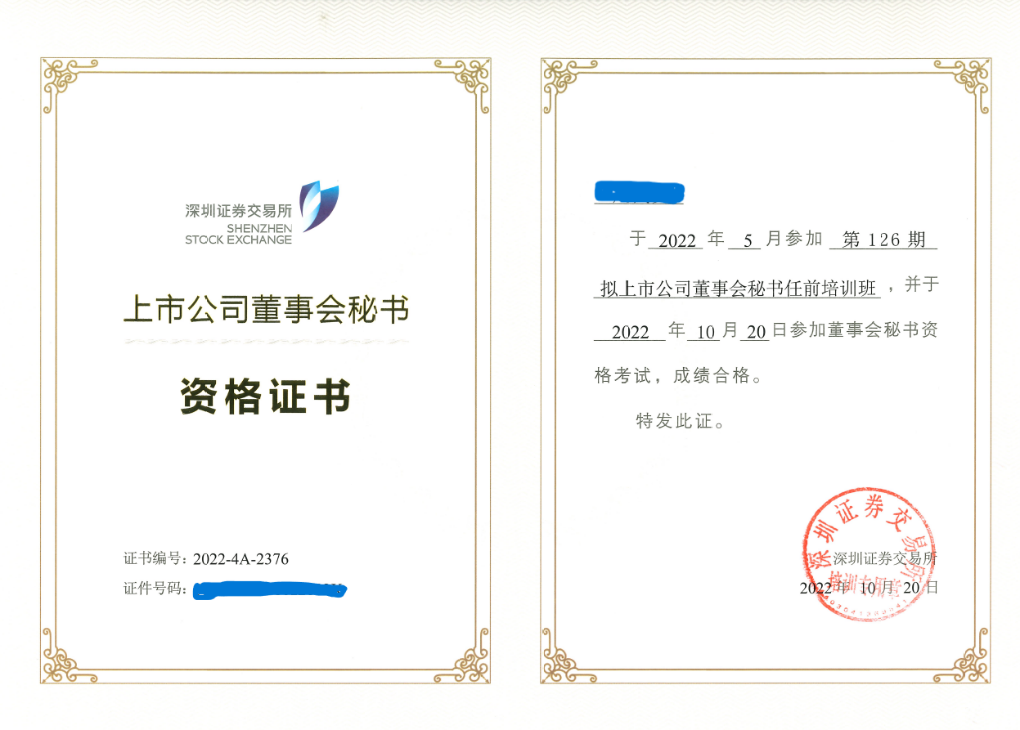 自2022年5月份起證券管理部全體業(yè)務(wù)人員參加了深圳證券交易所舉辦的董事會(huì)秘書任職資格專業(yè)培訓(xùn),對(duì)公司法、證券法、首發(fā)管理辦法、投資者關(guān)系管理要點(diǎn)、信息披露及股票上市規(guī)則、公司股權(quán)結(jié)構(gòu)的設(shè)計(jì)及搭建、證監(jiān)會(huì)最新法規(guī)修訂及整合情況、上市公司股權(quán)激勵(lì)、公募REITs基礎(chǔ)資產(chǎn)的發(fā)行要點(diǎn)等專業(yè)課程進(jìn)行了學(xué)習(xí)。目前,證券管理部全體業(yè)務(wù)人員已完成深圳證券交易所董事會(huì)秘書任職資格專業(yè)培訓(xùn),均已通過(guò)考試,取得了董事會(huì)秘書資格證書。
